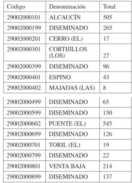 Sin embargo, además del seccionado censal hay otra división espacial del territorio, que lo cubre de manera exhaustiva, y a la que también queda referida la información padronal: el Nomenclátor de Entidades y Núcleos de población. Aunque es una delimitación sin carácter oficial, pero sí con una gran tradición, el Nomenclátor contiene una nómina de todas las entidades, núcleos de población y diseminados existentes en un municipio. Una entidad singular de población se define como «cualquier área habitable del término municipal, habitada o excepcionalmente deshabitada, claramente diferenciada dentro del mismo, y que es conocida por una denominación específica que la identifica sin posibilidad de confusión» (IECA, s.f. 2). Por su parte, un núcleo es «un conjunto de al menos diez edificaciones, que están formando calles, plazas y otras vías urbanas» (Ibid., 2). Todos los municipios están compuestos al menos por una entidad singular de población, entidad que puede tener uno o varios núcleos, o, en ausencia de éstos, ser considerada en su totalidad como diseminado. Así las cosas, el Nomenclátor distribuirá, en el peor de los casos, a la población empadronada en un núcleo y un diseminado, esto es, un escalón más que el que puede obtenerse empleando el seccionado censal. Además el Nomenclátor comparte con éste el que un empadronado no puede ser adscrito a dos unidades espaciales simultáneamente, desde el momento en que toda edificación no integrada en un núcleo pertenece a un diseminado, y una misma vivienda -y, por extensión un mismo empadronado-, no puede pertenecer a dos o más núcleos o a un núcleo y un diseminado a la vez. Pero pese a la utilidad potencial de esta fuente que puede intuirse, el Nomenclátor ha sido empleado en muy escasas ocasiones en investigaciones aplicadas a ámbitos urbanos (Montosa y Reyes, 2017), o rurales. Entre éstas últimas, Natera lo utilizó para dar cuenta de las variaciones en la distribución espacial de la población en tres pequeños municipios de la Costa del Sol (Natera, 1996), y Natera y Batista (2018) lo han utilizado recientemente para investigar la evolución de los volúmenes de población extranjera, y su distribución espacial, en municipios rurales de la comarca malagueña de la Axarquía.