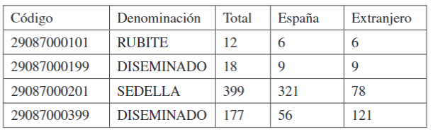 Una vez más el Nomenclátor identifica más unidades espaciales que el seccionado (tabla 3): en concreto dos núcleos, Sedella, la cabecera municipal, y Rubite, un pequeño núcleo localizado en el extremo sudoccidental del municipio, con un diseminado asociado al mismo (figura 3). Además, el Nomenclátor considera al resto del término municipal como diseminado, no adscrito a núcleo alguno, en la tabla 3 con el código 29087000399. Con esta información podemos comprobar cómo dos terceras partes de los empadronados del municipio residen en su cabecera, que en Rubite y su diseminado lo hace un total de 30 personas, y que nada menos que el 29% de la población reside en viviendas dispersas por el resto del término municipal. Una información sobre la distribución de la población imposible de obtener empleando el seccionado censal.