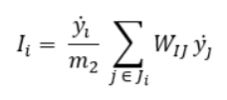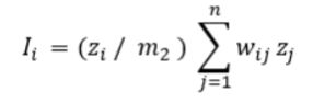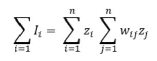 Siendo Yi e Yj los valores de la variable Y tomados en desviaciones de la media en las ubicaciones i, j. Wij hace referencia a la matriz de pesos espaciales, m2 reseña un factor de proporcionalidad constante en todas las unidades espaciales y Ji hace referencia al conjunto de unidades relacionadas con i. El resultado evidencia que la media de los valores de Ii será igual a la media de I por el factor de proporcionalidad.