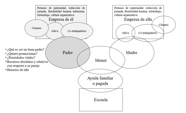 Estas preguntas de investigación se centran en el padre y su empresa, pero tienen también en cuenta la situación de la pareja, el contexto familiar y las ayudas externas para los cuidados, como muestra la figura 1 (incluye las preguntas que guiaron las entrevistas a los padres).