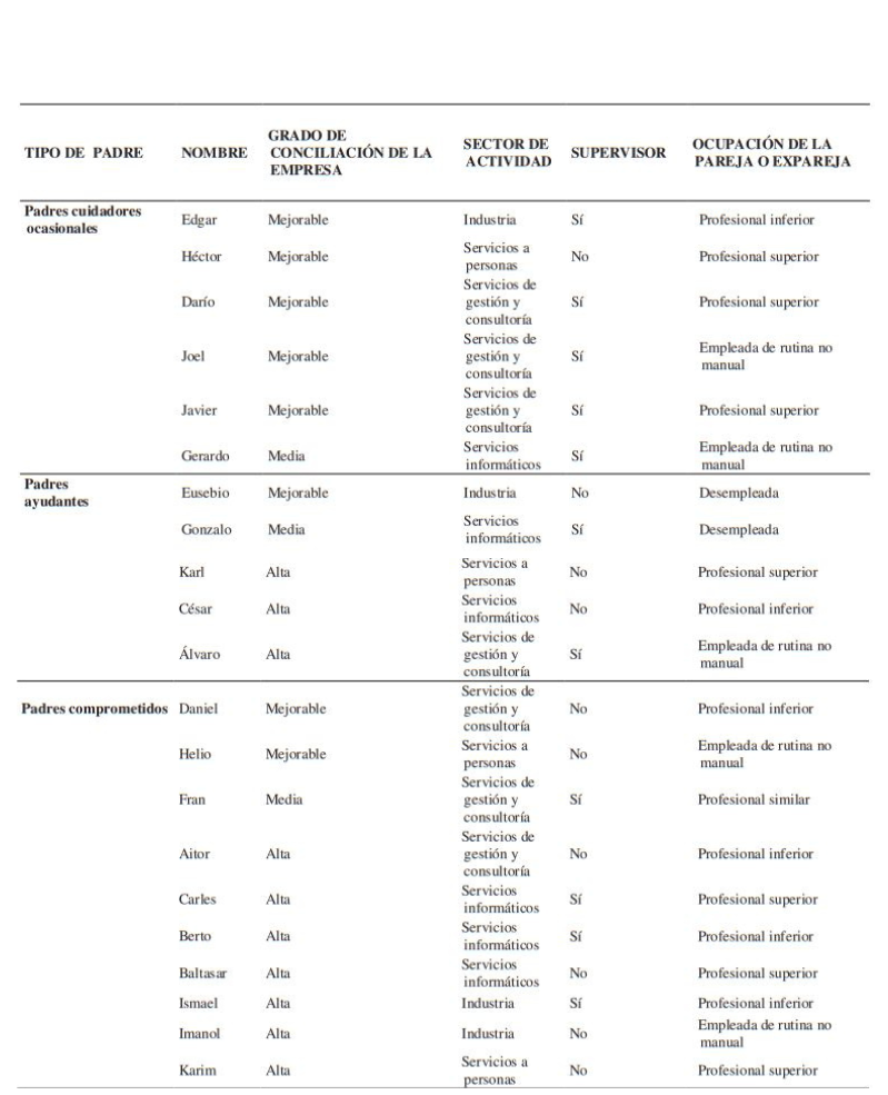 Según Kaufman (2013) se puede distinguir a los padres a partir de las adaptaciones laborales que hacen para poder conciliar empleo y familia. Así, mientras ciertos padres aumentan sus horas de trabajo y asumen nuevas responsabilidades para ascender profesionalmente o por necesidad económica (old dads), otros, por el contrario, realizan algún ajuste menor en sus trabajos con objeto de conciliar su vida laboral y familiar (new dads). Un tercer grupo, denominado superdads, anticipa la paternidad y realiza cambios laborales importantes (reducen la jornada o realizan teletrabajo). Estas distinciones aplicadas al caso español han llevado a proponer una clasificación tripartita de padres cuidadores ocasionales, ayudantes, y comprometidos (Abril et al. 2015), que es de interés en nuestro análisis para verificar su interacción con el grado de conciliación de las empresas (Abril et al. 2020).