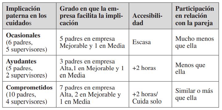 La especialización de sus parejas en los cuidados se justifica con sus preferencias y con ingresos desiguales según estos padres. No obstante, estos padres han usado el permiso de paternidad de 15 días (duración legal hasta 2017) a jornada completa, remunerado al 100% por la Seguridad Social.
