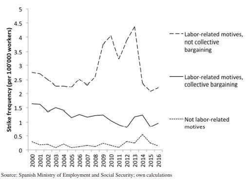 Looking at strike motives helps to understand the comparatively modest increase in strike frequency during the crisis period. The Spanish Ministry of Employment and Social Security distinguishes between ‘collective bargaining-related’, ‘other work-related’ and ‘not strictly work-related’ strikes —the latter referring to union-related strikes, solidarity strikes, or strikes against policy reforms. Figure 2 shows that the frequency of these three types of strikes evolved unequally over time. A general (but unsteady) downward trend can be observed for the frequency of collective bargaining-related strikes. The frequency of other work-related strikes sharply increased in 2009, remained high until 2013 and again showed lower values beginning in 2014. The frequency of not strictly work-related strikes remained rather low throughout the entire period —2014 being the only year that stands out with a peak value almost twice as high as the second highest value (measured in 2012). It becomes clear from Figure 2 that the general increase in strike frequency observed for the crisis period can largely be attributed to the increase in work -(but not collective bargaining)related strikes.