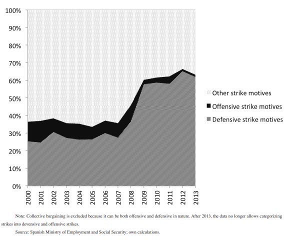 The analysis of the data shows that the share of defensive strikes approximately doubled in the course of the economic crisis (see Figure 3).7 This increase in defensive strike motives was accompanied by a decrease in “offensive” strike Importar imagen Importar tabla motives. At their peak, offensive strikes accounted for up to fourteen percent of work (but not collective bargaining-) related strikes. After 2008, they remained below the five percent level. However, the relative increase in defensive strikes went mostly at the expense of ‘other’ strikes.
