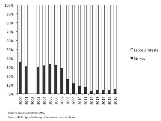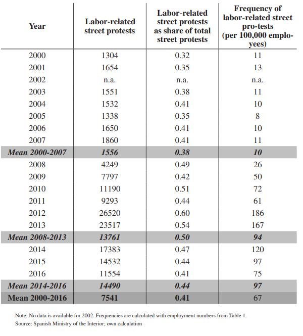 In this article, I presented a relational analysis of strikes and labor-related street protests between 2000 and 2016 in Spain. To this end, I examined aggregate data provided by Spanish ministries and combined theories on industrial conflict with theories on social movements. More specifically, I discussed the respective economic and political models of contention and examined the extent to which they contribute to a better understanding of labor contention in the recent history of Spain.