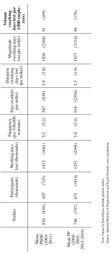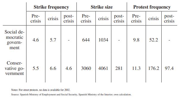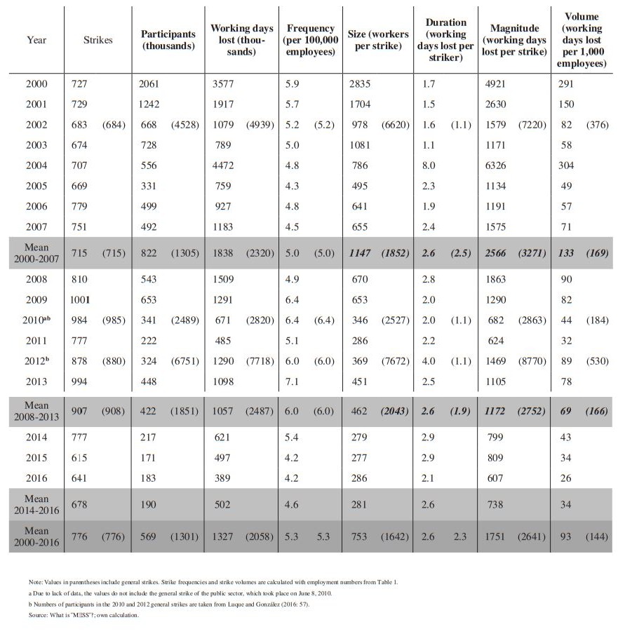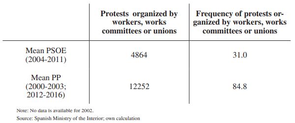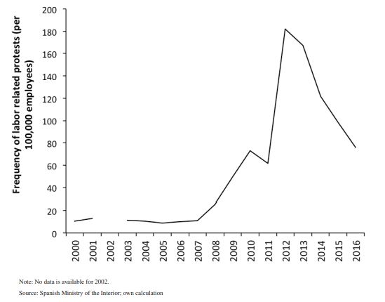 Because the Spanish Ministry of the Interior provides numbers of protesters only until 2009 and no information about the duration of protests, this study will mainly compare the respective frequencies of strikes and labor protests.