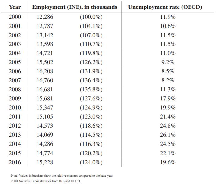 For the time period under study (2000-2016), economists dealing with the Spanish case distinguish between a pre-crisis period (2000-2007), a crisis period (2008-2013) and a period of stagnation or ‘moderate recovery’ as of 2014 (Banco de España 2017). Spanish labor market statistics reflect these three periods (see Table 1). The first eight-year period presents a relatively steady increase in the total number of people employed. The unemployment rates at first oscillated between 10.6% and 11.5%, but showed a declining trend after 2003. This trend was reversed still slightly in 2008 and sharply in 2009. After having reached peak values in 2013, unemployment rates decreased again beginning 2014, and the total number of people employed increased accordingly.