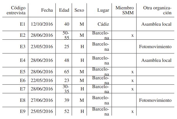 Antes de decidir la estrategia para reclutar a entrevistados, hemos hecho un estudio en profundidad del caso y un mapeo de los actores activos en el terreno. Del análisis preliminar emergió la necesidad de cubrir una serie de perfiles— que se convertirían en pautas para el muestreo de entrevistados—, a saber: 1) deberíamos cubrir actores trabajando en distintos niveles de movilización, desde el más local al nacional; 2) incluir voces y representantes de distintos sectores, como el Ayuntamiento de Barcelona, sindicatos o las asambleas de barrio; 3) dar cuenta de la variedad funcional dentro del movimiento social, incluyendo a personas que trabajan con medios (portavoces), pero también logística, organización, etc.; 4) dar cabida también a la perspectiva de personas que habían sido activas en el exterior, en el terreno. Poniendo en común las perspectivas de los distintos casos de estudio en el seno del proyecto internacional, habida cuenta de las particularidades de cada contexto, hemos pactado seguir la estrategia de la bola de nieve (“snowballing”). La primera entrevista nace de un contacto personal de uno de los actores, trabajadora social con menores no acompañados y participante en varios eventos de SMM, que permitió abrir el campo y progresivamente expandir nuestras redes. De este modo, teniendo en cuenta los criterios mencionados previamente, durante las entrevistas se valoraba con los entrevistados cómo seguir adelante y cuál sería la persona que tenía más sentido entrevistar. Asimismo, y en la medida de lo posible, hemos tratado de equilibrar factores sociodemográficos (sexo, edad) y membresía organizacional. Mientras la veintena de entrevistas realizadas sirve para contextualizar y enmarcar el análisis, en este artículo analizaremos en profundidad nueve de ellas, utilizando algunos extractos para ilustrar nuestros argumentos (véase Tabla 1).