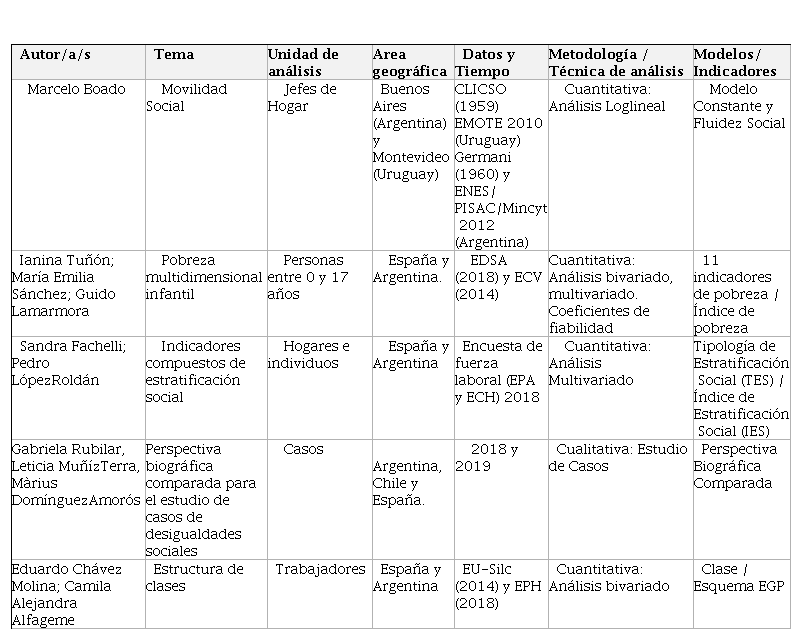 En primer lugar, Boado en su artículo “La movilidad social en Buenos Aires y Montevideo de 1960 a 2012” analiza un período de 50 años, tomando como base las encuestas de movilidad social más antiguas y más recientes en cada una de las ciudades. El autor contextualiza sus hipótesis dentro de la discusión contemporánea que analiza la movilidad social, que se enfoca especialmente en la asociación entre orígenes de clase, logros educativos, y clase actual. Aplica la metodología estándar en los estudios de movilidad para explorar las hipótesis sobre la fluidez constante, la desigualdad de oportunidades educativas, y el retorno del capital educativo. Así logra verificar cambios y tendencias divergentes en la movilidad y la reproducción de clases entre las dos ciudades. Por un lado, constata que la desigualdad de clase sigue dominando la movilidad social. Pero, a su vez, que entre ambas fechas se registra una mayor fluidez social en Buenos Aires que en Montevideo. Por otro lado, muestra resultados que reflejan que la desigualdad de clase continúa afectando el logro educativo, al tiempo que no advierte un avance sustantivo de la meritocracia, lo que atribuye en parte a la no correspondencia entre el logro educativo y a la posición de clase actual.
