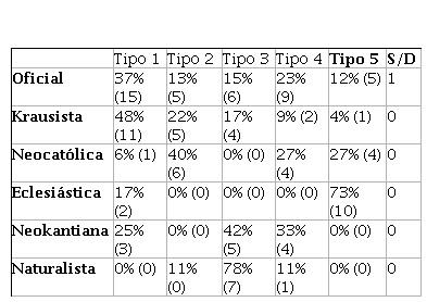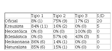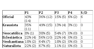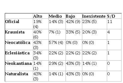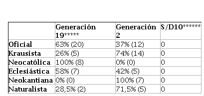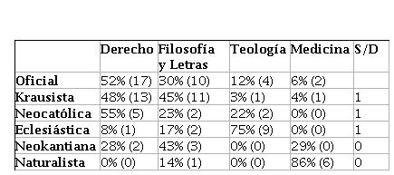Este proceso contribuye a explicar los rasgos sociológicos de la red krausista y su especificidad respecto la oficialidad isabelina. Por ejemplo, en relación con el origen social, sus miembros proceden sobre todo de familias de grandes funcionarios y oficiales del ejército (36%) y, si bien la carrera de Derecho sigue siendo relevante, el índice de quienes optan por estudiar Filosofía y Letras es mayor (45%). La procedencia geográfica es parecida a la de la red oficial, y por tanto comparte la lógica de cooptación, si bien, a través de espacios sociales alternativos. El peso de la educación religiosa es incluso menor: un 38% de sus miembros no han pasado por centros católicos y los que lo han hecho pertenecen a la primera generación. En relación con el grado de militancia, el 72% ha tenido algún tipo de vínculo. No obstante -junto con la red eclesiástica- es la que arroja un menor porcentaje al respecto, lo que está relacionado a mi juicio con la apuesta profesoral y académica que la caracteriza.