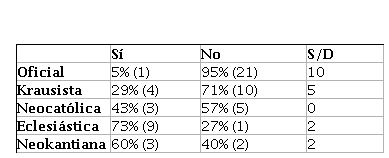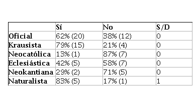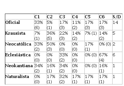 A partir de esta población, he reconstruido una trama de interacciones que permite hablar de 6 redes relativamente cohesionadas: la red oficial (32 individuos), la krausista (19), la neocatólica (8), la eclesiástica (12), la neokantiana (7) y la naturalista (7). Se trata ahora de entender qué caracteriza sociológicamente a cada una de ellas.5