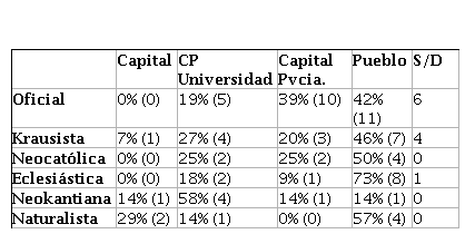 La relevancia del lugar de procedencia es mucho mayor de lo que resulta hoy día. No sólo se trata de los límites materiales de las comunicaciones, sino de que la comunidad local de procedencia constituía un sesgo distintivo en el proceso de socialización filosófica. Por otro lado, la estructura administrativa del Estado liberal potenciaba una notable centralización del entramado burocrático y universitario. Tomando en cuenta estas dos consideraciones, he distinguido 4 procedencias: capital del estado, capital de provincia con universidad, capital de provincia y pueblo.12