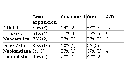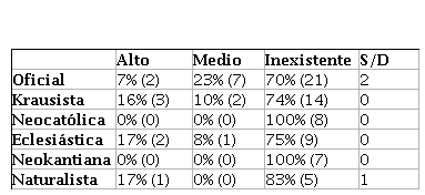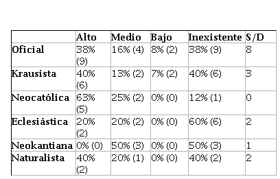 Se trata de una red con un grado de internacionalización mayor que la oficial, pero debido fundamentalmente a razones políticas. En cuanto al número de cátedras, muestra la cifra más exigua: sólo 1 de los miembros de la red ejerce como catedrático. La formación dominante es la de Derecho, seguida por los estudios de Teología y el 40% de sus integrantes privilegia una filosofía de corte político y moral. A diferencia del resto de las redes, la producción periodística domina sobre la monografía y el manual escolar, mostrando preferencia por publicaciones poco especializadas que reciben una atención relativamente escasa por parte del resto del campo filosófico.21
