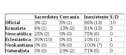 La pertenencia a una organización religiosa, aunque va perdiendo relevancia, constituye otra variable importante. También aquí he distinguido tres posibilidades: la ordenación sacerdotal, el trato de cercanía (v.g. paso por seminario) y la inexistencia de vínculo.