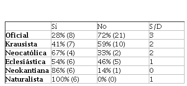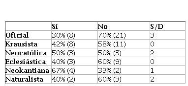 Se trata también de la red con un mayor grado de internacionalización (el 67% traduce a autores extranjeros, la cifra más alta) y el 86% ha realizado estancias en el extranjero.23 Este cosmopolitismo no redunda en acceso a cátedras universitarias (sólo 2 miembros de la red). Por otro lado, es la red que muestra junto con el krausismo, un mayor porcentaje de miembros formados en Filosofía y Letras (43%), con una alta representación de Medicina (29%). Esto contribuye a explicar una concepción de la filosofía apoyada sobre competencias de tipo empírico-científico (un 42%). En términos de poder institucional, la red neokantiana es la que muestra índices menores en los tres apartados (universitario, intelectual y político).