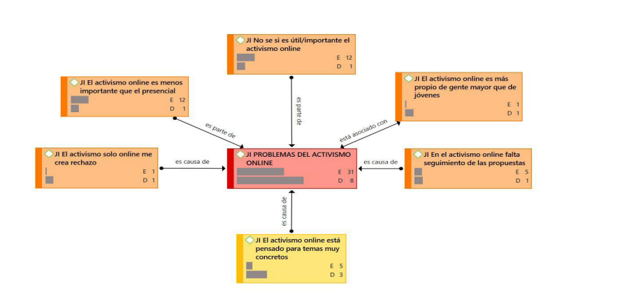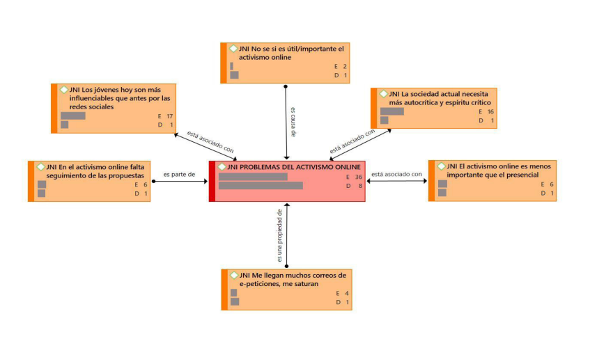En general, este código de «Problemas del Activismo Online» es muy importante para este grupo de JNI, ofreciendo un alto enraizamiento (E= 36) y una complejidad en el discurso notable, mostrando seis subcódigos directos en relaciones de asociación, relación directa, pertenencia y función directa: