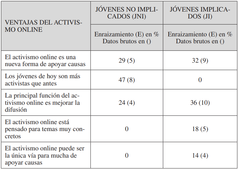 Pero, a diferencia del otro grupo de no-implicados (JNI) el discurso es más equilibrado subrayando ventajas e inconvenientes. Así, en cierto contraste con lo que planteamos en nuestra hipótesis, aquellos jóvenes que sí que participan en actividades presenciales (JI) en la medida que tienen una visión más positiva del activismo en general, por extensión, tienen también un discurso que detalla más elementos positivos del activismo en su modalidad online.