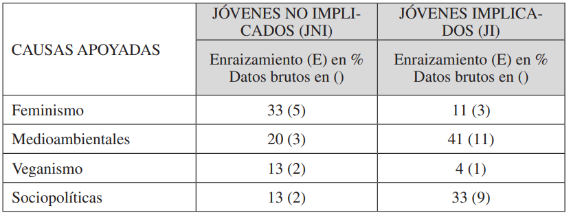 Entre las causas más apoyadas por los jóvenes estudiados destacan las sociopolíticas y las medioambientales (en ambos estudios), encontrando diferencias significativas en el cuantitativo, donde el propio proceso invita a una mayor disparidad de opciones. Es interesante cómo en los grupos de discusión aparecieron y se discutieron temas bastantes específicos, como el feminismo o el veganismo, cuestiones habitualmente presentes en los debates sociales actuales (H4).