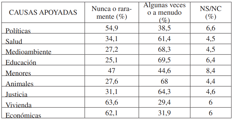 En la tabla 3 podemos ver los resultados de las causas apoyadas en la encuesta y vemos una mayor variedad e incidencia. Observamos cómo no aparece específicamente la variable «Feminismo» por encontrarse dentro de la categoría «Políticas» o incluso en la de «Justicia», y que la de «Medio Ambiente» es muy importante en ambos análisis. Otras con una incidencia importante en la encuesta, como «Educación», «Salud» o «Justicia», ni siquiera son mencionadas en los grupos de discusión, abriendo un interesante tema para posteriores investigaciones.