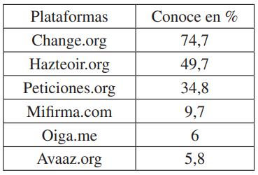 Como queda dicho, respecto al conocimiento de las plataformas de e-peticiones, en la encuesta se mostraba un alto conocimiento de Change.org, seguida por Hazteoir.org y Peticiones.org, como vemos en la tabla 4. En los grupos de discusión, el predominio de Change.org aumentaba, mostrándose en el grupo de JNI como la única plataforma conocida y en el de JI Change.org era la más conocida y se añadía la plataforma Decide.madrid, como elemento de participación digital local.