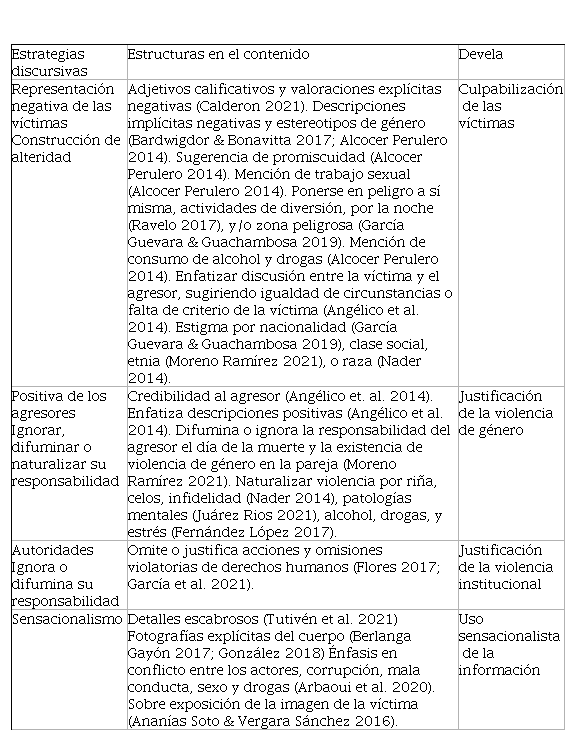 Estudios sobre la cobertura de los feminicidios en la región revelaron tres tipos de estructuras discriminatorias: sensacionalismo, culpabilización de las víctimas y justificación del agresor. La información es utilizada como un espectáculo que exacerba el morbo, lo que sirve a los diarios para incrementar sus ventas (Buitrón 1997). Los artículos impactan más que informar, con énfasis en detalles escabrosos del asesinato o del estado del cuerpo de la víctima, la sobre exposición de su imagen (Tutivén et al. 2021), y constantes faltas de contextualización (Ananías Soto & Vergara Sánchez 2016). Tienen efectos emocionales y llaman la atención, pero no sirven para empatizar con la víctima (Carranco 2020). Las notas generalmente se enfocan en las víctimas y en muchas ocasiones el agresor no se presenta ni establece (Moreno Ramírez 2021). Se construye una dicotomía entre mujeres buenas y malas: las primeras caracterizadas por su susceptibilidad a la violencia se les responsabiliza por no cuidar de sí mismas (Bardwigdor & Bonavitta 2017). Las segundas culpabilizadas de actos que fueron al menos una de las razones que dieron lugar al crimen (Fernández López 2017; García et al. 2021). Estas estrategias de culpabilización son variadas: mujeres que transgreden el imperativo de la monogamia, relación con un hombre casado o que se muestran liberales al acceder a las relaciones sexuales (Alcocer Perulero 2014), que salen por la noche y buscan divertirse (Ravelo 2017). La construcción de alteridad de un grupo determinado como la mención de ser extranjeras que refuerza la narrativa de ponerse en peligro (García Guevara & Guachambosa 2019), o de dedicarse al trabajo sexual (Alcocer Perulero 2014); las alusiones a pobreza, etnias indígenas (Moreno Ramírez 2021), y/o raza (Nader 2014). La mención de alcohol y drogas consumidos por mujeres bajo la idea de que los efectos pueden llevar a comportamientos irresponsables y promiscuos (Alméras & Montaño 2007). Construcciones narrativas como ‘ir al encuentro de su asesino’, enfatizar la ‘discusión’ sugiriendo igualdad de circunstancias, o que la víctima habría salido del hogar en una zona peligrosa (García Guevara & Guachambosa 2019). La responsabilidad también se traslada a los familiares y especialmente a las madres acusadas de ‘permitir’ los asesinatos por no evitar los hechos o no encontrarse presentes en ese momento (Calderón Garro 2020).