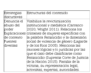El ACDF destaca la importancia de analizar también los discursos de resistencia (Lazar, 2007), lo que es una novedad en los estudios de discursos sobre feminicidio que en general tienden a priorizar la denuncia de contenido discriminatorio. Nuestra metodología permitió identificar que la discusión de leyes y políticas contra el feminicidio, la denuncia de la revictimización institucional y mediática representan rupturas en el sistema patriarcal institucional. Estos discursos provienen principalmente de historias de búsqueda de justicia de los familiares (Matehu Espinel 2019), y de movilizaciones sociales físicas y en redes sociales que han logrado una visibilidad sin precedentes (Belotti et al. 2021). Incidieron directamente en discursos institucionales y fueron fuente en la prensa tradicional; lo que comprueba que el estudio de medios tradicionales sigue siendo una forma de analizar los discursos de actores influyentes (Van Dijk 1996), las redes sociales entre estos.