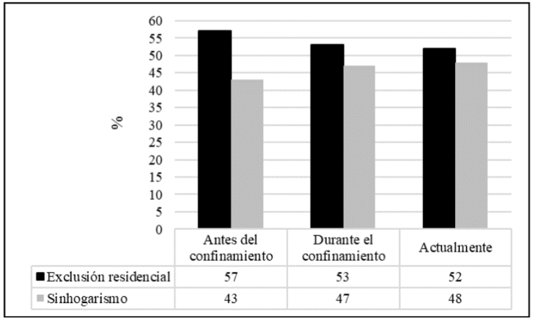 Tal y como se describía para la dimensión laboral, la situación de exclusión social de las PsSH participantes era previa a la pandemia. Sin embargo, de los resultados se deriva que las desigualdades sociales constituyeron escenarios de vulnerabilidad social que potenciaron el impacto de la COVID-19 (Cabezas 2020; Canales 2020). En este sentido, se apunta a un impacto fundamental de la pandemia en la concepción de los procesos de exclusión social. Es decir, igual que la crisis de 2008 generó procesos de movilidad social descendente (de la Fuente-Roldán y Sánchez-Moreno 2020), la pandemia puso de manifiesto que las líneas que separan a la población de las situaciones de exclusión social son flexibles, dinámicas y fácilmente permeables. Este dinamismo y flexibilidad se ha visto potenciado por la transformación de determinadas dimensiones de la exclusión social. Precisamente, una de las dimensiones de exclusión social en las que la pandemia parece haber tenido un impacto mayor es la relativa a la situación residencial de las PsSH.