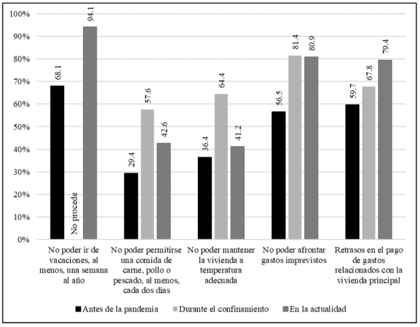 En este sentido destacan las personas que manifestaron dificultades para para pagar los gastos relacionados con su vivienda (el 59.7% antes de la pandemia; el 67.8% durante el confinamiento y el 79.4% en el momento de administrar el cuestionario) y que son incapaces de afrontar gastos imprevistos (el 56.5% antes de la pandemia; el 81.4% durante el confinamiento y el 80.9% en el momento de administrar el cuestionario).