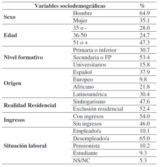 La edad media de la muestra es de 46.29 años (SD = 14.76; mínimo 19 máximo 80). De manera concreta, el 28% tiene 35 años o menos; el 24.7% tiene entre 36 y 50 años; y el 47.3% tiene 51 años o más. El 35.1% de las PsSH participantes son mujeres y el 64.9% son hombres. Además, el 37.9% son de nacionalidad española, teniendo nacionalidad extranjera el 62.1% (el 9.9% de otro país europeo; el 21.8% de un país africano y el 30.4% de un país latinoamericano). En cuanto a la situación residencial, el 47.6% de las PsSH se encuentran en situación de sinhogarismo y el 52.4% están en situación de exclusión residencial. Respecto al nivel formativo, más de la mitad (53.4%) de las PsSH participantes refieren tener estudios secundarios o de Formación Profesional, cifra similar a las personas participantes que afirman disponer de algún tipo de ingreso económico en el momento de ser entrevistadas (54%). Respecto a la situación laboral, se trata de una muestra mayoritariamente en situación de desempleo (65%), aunque destaca que en torno al 10% refieren estar trabajando (10.1%), ser pensionistas (10.2%) o estar estudiando (9.3%). Estos datos se encuentran resumidos en la tabla 1.