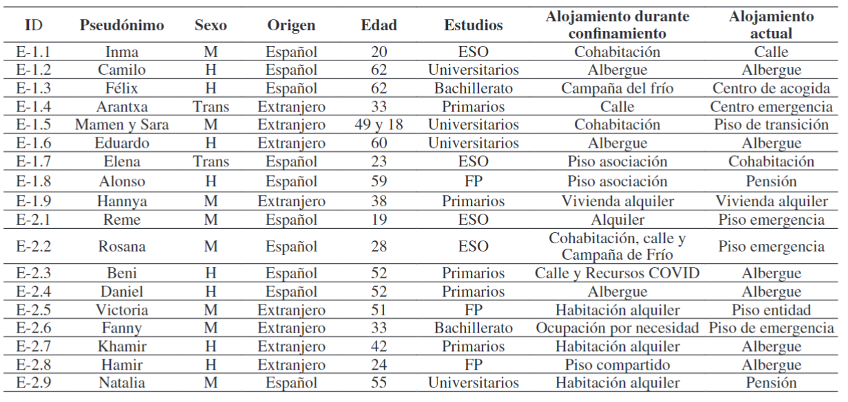 Por su parte, el muestreo cualitativo se siguió criterios de representatividad socioestructural, siendo no probabilístico, intencional y teórico (Charmaz 2006). Se entrevistó a 18 personas. Entre ellas, como se muestra en la tabla 2, se encuentra una gran diversidad de participantes en cuanto a las variables sociodemográficas básicas (sexo, edad, origen, nivel de estudios) pero, sobre todo, respecto a las situaciones residenciales experimentadas tanto durante el confinamiento como en el momento de ser entrevistadas. Esto, junto a la variedad de la muestra cuantitativa descrita, permitió acceder al grueso de realidades residenciales que definen las diferentes situaciones de sinhogarismo.