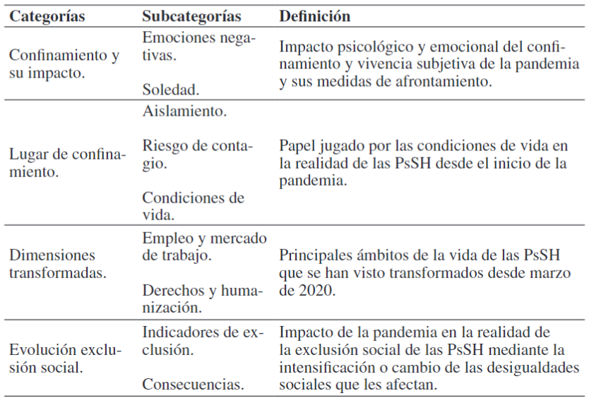 El presente trabajo recupera una parte de los resultados obtenidos en una investigación más amplia centrada en analizar el impacto de la pandemia en la salud, condiciones y calidad de vida de las PsSH de la Comunidad de Madrid. Haciendo uso de un diseño metodológico mixto mediante la encuesta a través de cuestionario y la entrevista en profundidad de carácter semiestructurado, se analizan las vivencias y experiencias de las PsSH durante el confinamiento y la pandemia. Además, se profundiza en las dimensiones que permiten explicar y comprender el impacto específico que la situación de emergencia sanitaria tuvo en esta población.
