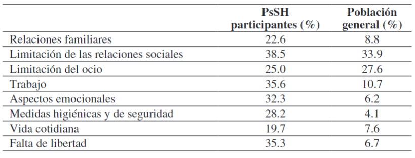 Sin embargo, en el presente trabajo, un 16.2% de las PsSH participantes manifestó haber tenido COVID-19. En febrero de 2021, el porcentaje de personas de la población general española que señalaba haber tenido la enfermedad estaba más de siete puntos por debajo (9%; CIS 2021).
