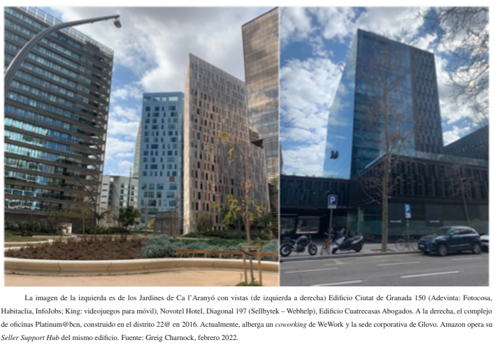 Y en Barcelona, se le atribuye a la gran cantidad de espacios de coworking proporcionar, precisamente, un habitus apropiado para el ecosistema de startups de la ciudad (2020: 16). Sin embargo, parece ser que estos espacios estaban ocupados en su mayoría por equipos remotos de grandes empresas tecnológicas foráneas en lugar de emprendedores y “nómadas digitales” (Soler y López, 2019). Al ofrecer de forma flexible “despachos con servicios de oficina”, estas nuevas promociones deben verse, por lo tanto, como una instancia más de la plataformización del trabajo (Richardson, 2021)