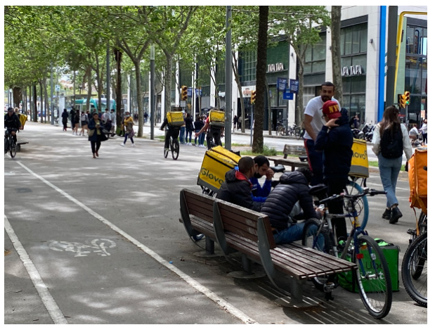 Todo esto forma parte de la tendencia hacia la “compresión del espaciotiempo” que se ha convertido en un atributo definitorio del capitalismo desde la década de 1980 (Harvey, 1989a), dinámica que las nuevas tecnologías y medios de comunicación no tan solo han habilitado sino que también intensificado. Hacer posible que el consumo de un viaje en taxi o de comida preparada sea lo más simple y casi instantáneo es precisamente el tipo de “solución” que ofrecen compañías como Uber o Glovo. Las plataformas en línea pueden procesar pedidos y organizar la entrega en cuestión de segundos, aunque, en última instancia, el cumplimiento del pedido (a satisfacción del cliente y del evaluador) depende de poder desplegar un servicio de mensajería cercano en cualquier momento. Como bien se ha documentado, las plataformas dependen de que este trabajo de mensajería sea, en primer lugar, abundante. A finales de 2018, el 18% de los adultos en España habían trabajado para una plataforma (Urzì Brancati et al., 2020: 14), llegando al 30% en Cataluña (Digital Future Society, 2020). En segundo lugar, y dados los modelos de negocios “ajustados” de las plataformas, esta mano de obra debe ser de bajo coste. Las formas de empleo de la economía gig (de plazo corto y fijo, en cual trabajadores “autónomos” están pagados por la ejecución de tareas discretas y contratados a través de plataformas digitales)7 han sido objeto de mucha controversia por el incumplimiento de las plataformas con las leyes de salario mínimo, las contribuciones a la seguridad social, la legislación contra la discriminación, el pago por enfermedad y las vacaciones (ver Bedoya Dorado y Peláez León, 2021). En España, por supuesto, esto ha resultado en una nueva legislación, aprobada en mayo de 2021, para hacer cumplir los derechos laborales de los mensajeros (la llamada Ley Rider). En tercer lugar, las plataformas de entrega a domicilio necesitan usar las infraestructuras urbanas existentes tanto para generar los efectos de red que requieren para recopilar y usar datos como para la circulación y la movilidad, por ejemplo, para la entrega rápida de alimentos a domicilio. Como explican Stehlin, Hodson y McMeekin (2020: 1263), como modelos de negocio just-in-time, es poco probable que las plataformas aporten recursos para la transformación de nuevos arreglos espaciales. En cambio, operan en los “huecos” e intersticios entre las infraestructuras peatonales existentes y las infraestructuras de movilidad construidas, y entre estas últimas y los esfuerzos financiados en gran parte con fondos públicos para reducir la dependencia de las poblaciones urbanas de la movilidad (mediante, por ejemplo, la construcción de carriles para bicicletas o zonas libres de coches).
