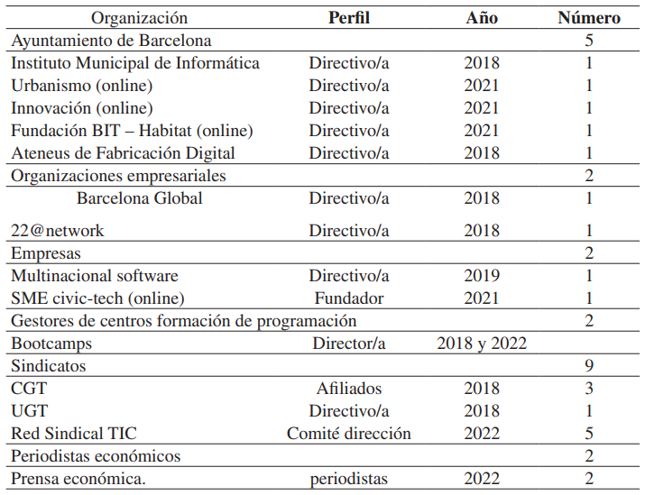 Para ello, construimos nuestro argumento en torno a una serie de conceptos extraídos del trabajo pionero del geógrafo David Harvey. Aunque a menudo se hace uso de conceptos específicos de la obra de Harvey, su trabajo rara vez se despliega como marco más holístico para el análisis o la crítica. Desafortunadamente, las limitaciones de espacio en este artículo no nos permiten consolidar y aplicar un marco de este tipo de manera completa y sistemática, por lo que en su lugar esbozaremos brevemente una variedad de sus conceptos y argumentos relacionados, y los usaremos como heurística para capturar algunas de las características generales del desarrollo de la economía espacial del capitalismo y de la urbanización desde la década de 1980. Luego pasaremos a explicar cómo esto nos ayuda a comprender algunos de los impactos más preocupantes del capitalismo de plataformas sobre la urbanización y la vida cotidiana a través del caso de Barcelona. Nuestro argumento se basa en los hallazgos de un estudio empírico piloto sobre los determinantes del crecimiento de la economía digital en Barcelona, con un foco en las transformaciones del mercado laboral. Esta investigación comenzó en 2018 y, después de una larga pausa debido a las restricciones del coronavirus, se reanudó en febrero de 2022 con la ayuda de una subvención de recuperación de investigación de la Universidad de Mánchester. El estudio comprendió una investigación documental, así como varios períodos de trabajo de campo colaborativo en Barcelona, durante los cuales entrevistamos a una muestra pequeña, pero cuidadosamente seleccionada, de actores (tabla 1). Finalmente, nos centramos en el caso de Glovo, que ejemplifica en varios aspectos lo que nos preocupa sobre la urbanización del capitalismo de plataformas en Barcelona.