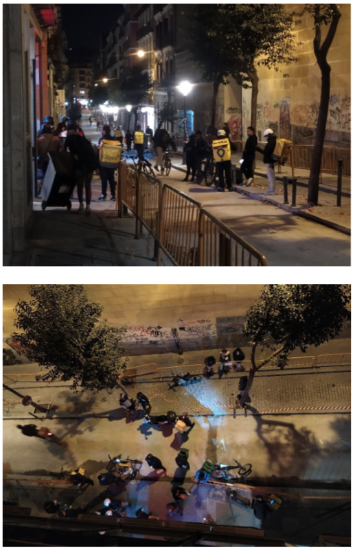 Aparte de los apartamentos, el bajo comercial se comercializó a través de la inmobiliaria Engels and Volkers, especializada en el sector de lujo, para finalmente ser alquilada a Vicio, firma de restauración especializada en hamburguesas, fundada en Barcelona por Alex Puig, ganador del concurso televisivo Master Chef en su edición de 2017. A diferencia del local matriz de Barcelona, un restaurante en la Vía Augusta, la sucursal de Divino Pastor funciona como una dark kitchen de delivery a domicilio (como el resto de locales de la marca abiertos a fecha julio de 2023, 5 más en Madrid, 4 en Barcelona y otros 7 en otras ciudades). La peculiaridad de este local es que además el reparto de los paquetes a los riders (de diversas empresas, pero especialmente Glovo) se hace en la propia calle, con una pantalla electrónica que informa de los pedidos a través de la fachada acristalada. Esto produce aglomeraciones de riders en el espacio público (Figura 2), lo que ha obligado a la empresa a anunciar que contratará un street manager, con los consiguientes problemas de ruido en una calle que hasta el momento de la implantación del local era de las más tranquilas de Malasaña por la excepcional ausencia de bares y la presencia de un convento que ocupa buena parte de la manzana opuesta (Casado, 2022)