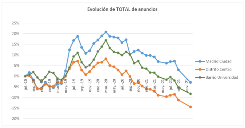 El año 2014, de la venta de Divino Pastor, coincide aproximadamente con el momento en que comienza a hacerse realmente patente el desembarco del fenómeno Airbnb en Madrid. Si se observa la evolución de la oferta de esta plataforma en los datos ofrecidos por Inside Airbnb, se aprecia cómo, a partir de entonces, aumenta de manera imparable, sin haber alcanzado un techo en el momento en que las restricciones a la movilidad derivadas de la gestión de la pandemia mundial producen un quiebro fatal en la tendencia. Un verdadero revés para un mercado cuyo valor se basa en el continuo crecimiento y donde aún no se ha recuperado la oferta de marzo 2020. En datos de abril de 2022, la oferta de apartamentos completos -según Inside Airbnb- respondía a un 61,1% para el conjunto de la ciudad, un 72,4% para el Distrito Centro y un 72,1% para el Barrio Universidad.