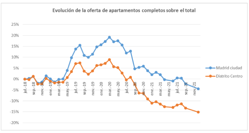 Desde el inicio se produce un incremento continuo del peso de la oferta de los apartamentos completos en alquiler sobre el total (Figura 3), y de aquí probablemente estemos asistiendo a un siguiente salto con el avance hacia fórmulas de concentración de la oferta en edificios completos y gestión profesionalizada, de la mano de los cambios producidos con el desembarco de fondos y socimis en el mercado inmobiliario (Aranda, 2019) Tras marzo de 2020 la oferta de apartamentos completos cae más pronunciadamente, desplazándose previsiblemente de manera momentánea al mercado de alquiler de larga duración. Sin embargo la oferta global en el barrio de Universidad resiste por encima del distrito Centro (Figura 4) lo que permite hipotetizar que se trata de productos muy especializados para el turista que les resta flexibilidad de adaptación-