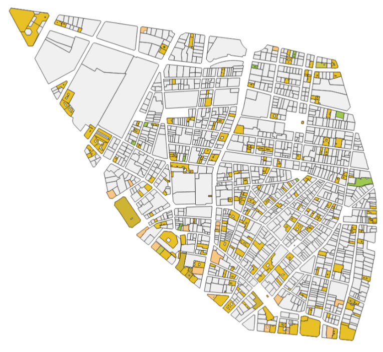 La Figura 5 muestra la concentración de la propiedad sobre el parcelario del barrio de Universidad. De 1.520 parcelas, 274 lo son sin división horizontal, lo que representa un 18% del total. Aunque se advierte una concentración en el límite sur del barrio, La Gran Vía, esta imagen es representativa tanto de la zona como del centro urbano, donde el porcentaje de edificios de propietario único, tanto públicos como privados, tienen un peso importante. Esta característica puede convertirse en un arma de doble filo en un contexto reciente donde nuevos actores inmobiliarios están ejerciendo mucha presión sobre el mercado (fondos, socimis, etc) haciendo más permeable su entrada a posibles inversiones en activos completos.
