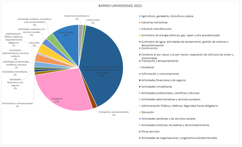 Algunas de estas tendencias se hacen todavía más palpables si nos fijamos específicamente en algunas de las actividades fetiches de la gentrificación. La explosión de muffins y pan de masa madre es más que patente: panaderías, pastelerías con y sin obrador crecen un 60% en la ciudad, pero del orden del doble en Centro y Universidad. Los servicios personales o de cuidados, como pueden ser centros de estética, peluquerías, tintorerías y tiendas para mascotas, se hacen seña de identidad para el barrio de Universidad. También el aumento de librerías y cafés librerías, que mientras que se pierden en el conjunto de la ciudad, abren en un 10% más en barrios cuya densidad cultural aumenta. Así mismo, el alojamiento temporal -en sus diversas fórmulas-, también incrementa: un 65% en la ciudad, y un 92% en el barrio de Universidad, sobre todo a partir de hostales y apartahoteles. Por último, las actividades registradas como procesado y conservación de platos preparados y su comercio al por mayor, son casi cuatro veces más numerosas hoy que en 2015 para el conjunto de la ciudad, desembarcando en Centro y Universidad.