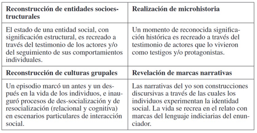 Los testimonios deben ser considerados verdaderos instrumentos de reconstrucción de la identidad y no solamente relatos factuales, limitados a una función informativa (Pollak, 2006). La narración de la propia vida implica una tarea doble. En primer lugar, el sujeto realiza una selección de contenidos de un conjunto más amplio, escoge cierta información respecto a los eventos que afectan al yo. Y al hacerlo, construye una imagen de sí mismo ante el/la narratario/a y/o ante el público más amplio al que se dirige a través de él (incluido él mismo). Idalina Conde (1993) asigna a estas tareas los términos de self telling y self making, respectivamente. En síntesis, los testimonios no solo presentan hechos, sino que también nos hablan de quién es el/la narrador/a o de qué modo quiere ser visualizado/a o reconocido/a (Fischer Rosenthal, 2000; Meccia, 2016).