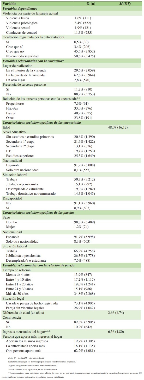 Basándose en las evidencias previas, se incluyeron como variables independientes una serie de variables relacionadas con la entrevista y cuya información fue proporcionada por las entrevistadoras, como fueron el lugar de realización de la entrevista (en el interior de la vivienda; en la puerta de la vivienda; en otro lugar), así como quiénes eran las personas que se encontraban presentes durante la misma (progenitores; pareja; hijos/as; otros). También se incluyeron una serie de variables sociodemográficas de las entrevistadas, como fueron la edad (en rangos), el nivel educativo (sin estudios o estudios primarios; secundaria 1ª etapa; secundaria 2ª etapa; F.P.; estudios superiores), la nacionalidad (española o española y otra; otra nacionalidad), la situación laboral (trabaja; jubilada o pensionista; desempleada o estudiante; trabajo doméstico no remunerado) y la discapacidad (sí; no).