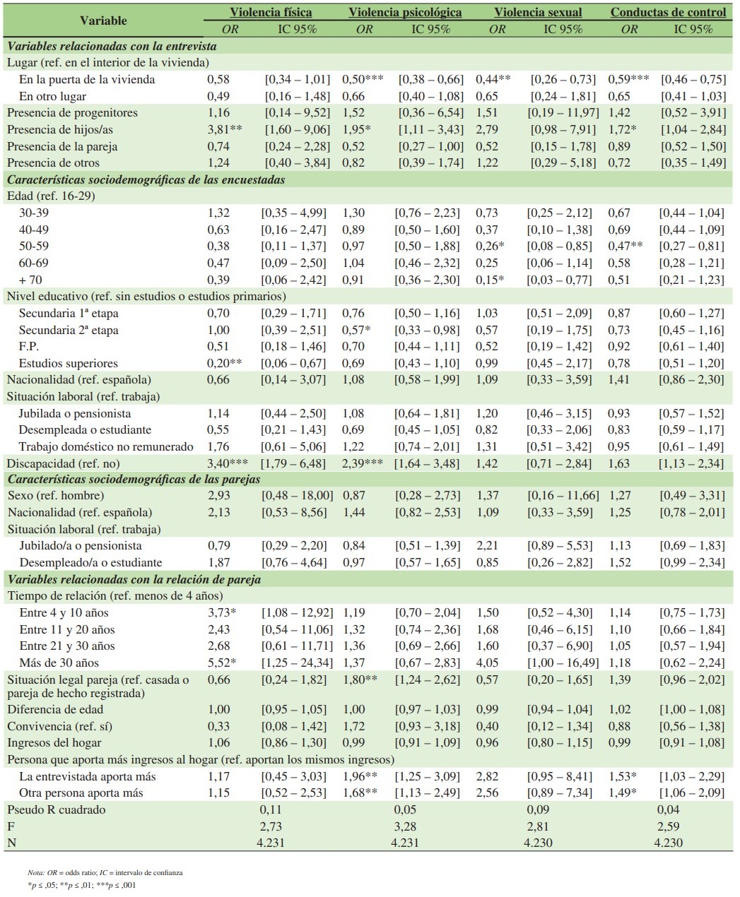 Para examinar los factores asociados a la revelación de las distintas formas de violencia estudiadas, se estimaron una serie de modelos de regresión logística. Los resultados de los modelos se presentan en la Tabla 2. Como se muestra, el lugar de realización de la encuesta y la presencia de terceras personas fueron variables significativas en todos los modelos. Concretamente, los resultados mostraron que la presencia de hijos/as se asocia con una mayor probabilidad de revelar violencia física (OR = 3,81; p = ,002), violencia psicológica (OR = 1,95; p = ,021) y conductas de control (OR = 1,72; p = ,036). Tambiénse halló que realizar la entrevista en la puerta de la vivienda, en lugar de en su interior, se asocia con una menor probabilidad de revelar episodios de violencia psicológica (OR = 0,50; p ≤ ,001), violencia sexual (OR = 0,44; p = ,002) y conductas de control (OR = 0,59; p ≤ ,001).