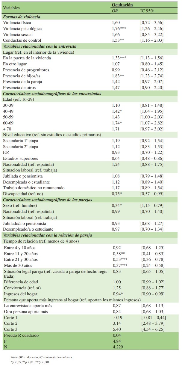 También se incluyó como variable dependiente la ocultación (“¿Cree que la entrevistada ha ocultado alguna situación o caso de violencia?” cuyas categorías de respuesta fueron “sí”, “creo que sí”, “creo que no”, “no con toda seguridad”6), una pregunta dirigida a las entrevistadoras y situada al final del cuestionario sobre la percepción de ocultación de situaciones de violencia por parte de las encuestadas. Esta variable se incluyó como dependiente en los análisis con el propósito de examinar los factores asociados a la percepción de encubrimiento de las situaciones de abuso.