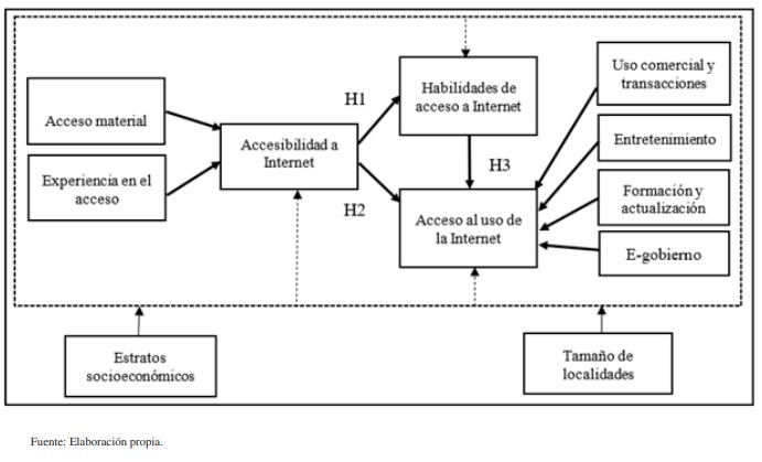 El acceso al uso de Internet constituye la última etapa de la apropiación de la red, que se enfoca en el tipo de usos, una vez que se cuenta con el acceso a Internet (van Deursen y Solis Andrade, 2018; van Deursen y van Dijk, 2015). Independientemente de la disponibilidad del acceso, varios estudios han documentado que los usuarios no disfrutan de Internet de la misma manera. De hecho, suelen interferir en el uso factores de exclusión dictados, entre otros, por aspectos de género, demográficos, sociales y económicos que terminan cerrando el acceso de algunas categorías sociales a ciertos tipos de usos (van Deursen y Helsper, 2015; van Dijk, (2012); Yu et al., 2018). A modo de ejemplo, contar con recursos económicos escasos reduce la capacidad de realizar compras y pagos en Internet, obstruyendo selectivamente el uso comercial y de transacciones que conforman una de las dimensiones del acceso a Internet (Büchi et al., 2016, Toudert, 2019). Los otros usos, como el entretenimiento, que suele ser el más abierto, exhibe a una al uso diferente de la formación-actualización y el e-gobierno que dependen, entre otros, de la edad, el nivel educativo y el grado de involucramiento sociopolítico (Nandal y Singla, 2019, van Deursen et al., 2015). Desde otra perspectiva, el conjunto de los constructos abordados en los párrafos precedentes sirvió de base para modelaciones que involucraron diferentes interrelaciones causales en estudios anteriores. Se encontró que la accesibilidad a Internet incide de manera significativa en las habilidades de acceso a Internet en Ghobadi y Ghobadi (2015) y Tirado-Morueta et al. (2017) y Toudert (2019). Del mismo modo, esta accesibilidad a Internet, que parece regir las demás etapas del aprovechamiento, también fue evidenciada por su impacto significativo en el uso de la red en Ghobadi y Ghobadi (2015) y Toudert (2019) y van Deursen y van Dijk (2015). El uso de Internet también fue hallado influido por las habilidades de acceso a la red, que se evidenciaron como determinantes en el aprovechamiento que los usuarios hacen de estos artefactos y servicios (Ghobadi y Ghobadi, 2015; Tirado-Morueta et al., 2017; van Deursen y van Dijk, 2015). Considerando la relevancia de los antecedentes presentados anteriormente, este estudio busca comprobar, dentro del marco mexicano de apropiación socioterritorial de las TIC, las hipótesis de que una accesibilidad más amplia a Internet conduce a un mayor uso de la red (H2), y que este efecto se encuentra mediado por el aumento de las habilidades de acceso que permiten profundizar el uso (H3).
