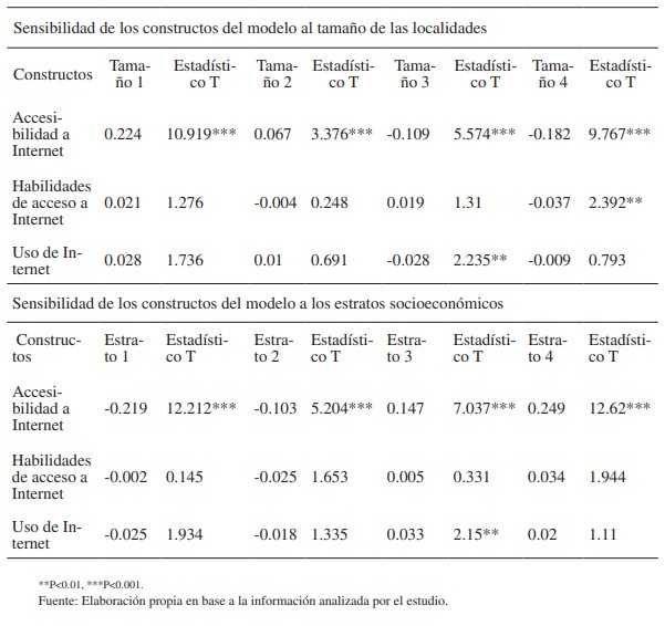 La sensibilidad de los constructos de segundo orden en nuestro modelo de investigación, que fue inducida por el tamaño de las localidades y los estratos socioeconómicos, se evaluó mediante un bootstrap de 5,000 remuestreos. Para esto, se aplicó el método de predictores categoriales con variables indicadoras (Russolillo y Lauro, 2011). Los hallazgos revelan que el constructo accesibilidad a Internet presenta una sensibilidad significativa (P<0.001) en todos los tamaños de localidades analizados. Además, el constructo ‘uso de Internet’ muestra una sensibilidad significativa (P<0.001) para localidades de tipo 3 (de 2,500 a 14,999 habitantes), y el constructo ‘habilidades de acceso a internet’ para localidades de tipo 4 (menos de 2,500 habitantes). En cuanto a los estratos socioeconómicos, el constructo accesibilidad a Internet muestra sensibilidad significativa en todos los estratos (P<0.001), mientras que el constructo uso de Internet solo muestra esta sensibilidad para el estrato 3 (medio alto) con P<0.01 (véase tabla 5).
