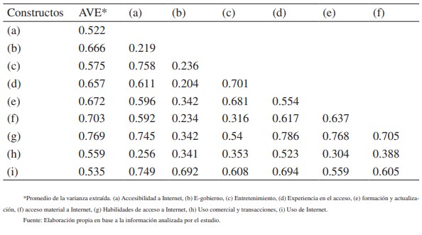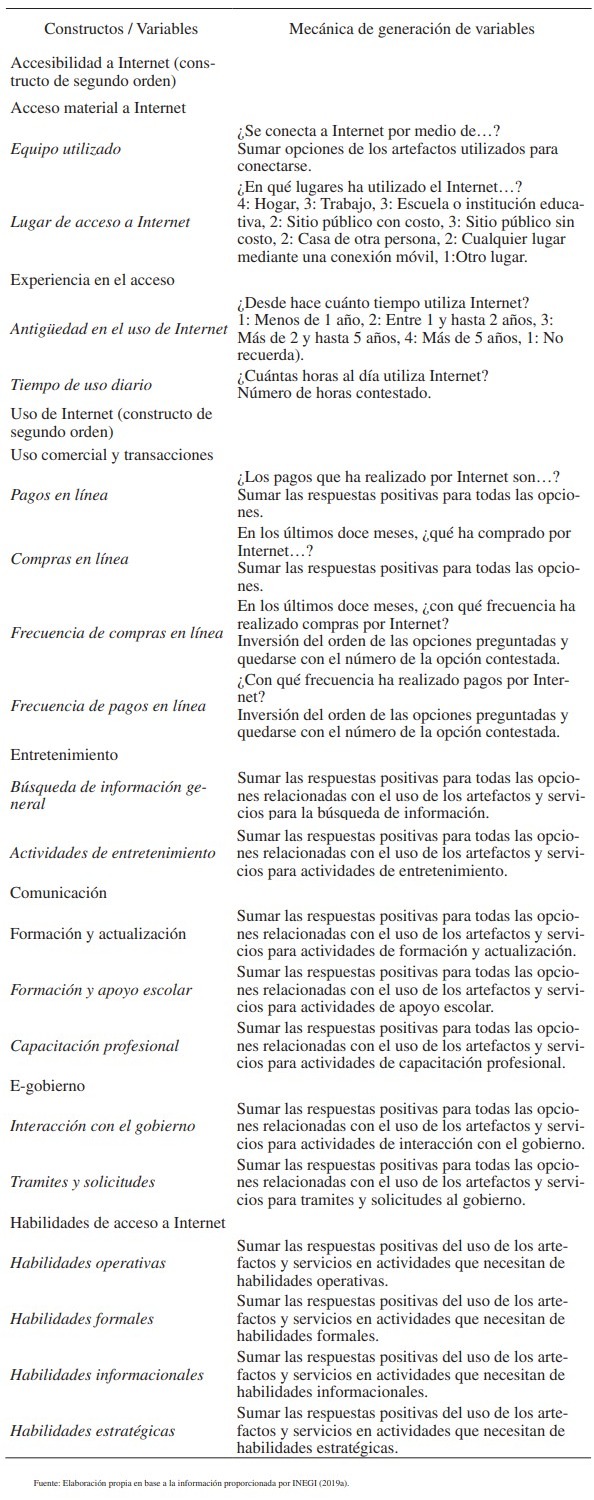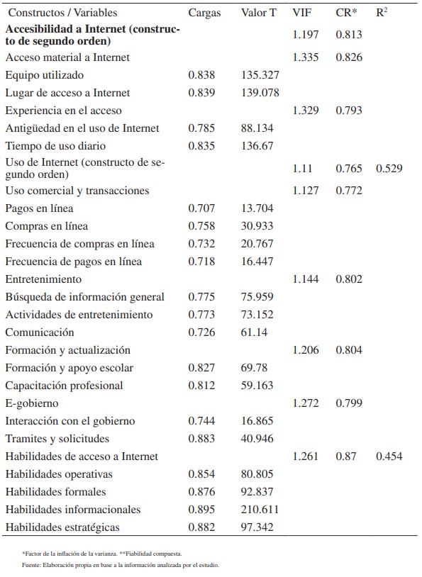 Tanto las mediciones como las escalas utilizadas para caracterizar las variables latentes como los ítems del estudio son mencionados en la tabla 6, fueron tomados de estudios anteriores que usaron modelos de investigación similares (Tirado-Morueta et al., 2017; Toudert, 2019; van Deursen y van Dijk, 2015).