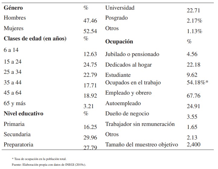 Desde la perspectiva de la muestra analizada, la población objetivo se caracteriza por una distribución de géneros similar a la que predominaba en todo el país durante 2020 (INEGI, 2020). Aproximadamente el 78% de los entrevistados tienen una edad que oscila entre 6 y 44 años, con un 37% de ellos menores de 25 años. Un poco más del 50% cuentan con una formación escolar de preparatoria y universidad, niveles que generalmente se asocian con un uso frecuente de las TICs. El 54% de la muestra se encuentran profesionalmente ocupados y un 67% de esta población se dedican a labores de empleados y obreros (véase la tabla 1).