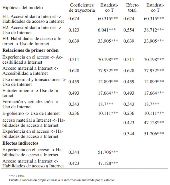La evaluación del modelo estructural resalta, en primer lugar, un adecuado poder de predicción del modelo de investigación a través de las variables endógenas. Esto se evidencia en un R2 que muestra tasas moderadas de la varianza explicada por los constructos de uso de Internet (53%) y habilidades de uso de Internet (45%) (Henseler et al., 2016). A continuación, observamos que todas las hipótesis planteadas por el modelo de investigación (H1, H2 y H3) y sus efectos totales, que se evaluaron con bootstrap de un remuestreo de 5,000, resultaron significativas con P<0.001 (ver tabla 4). De la misma forma, todas las relaciones y sus efectos totales entre los constructos de primer y segundo orden del modelo resultaron significativos con P<0.001. Los dos únicos efectos indirectos registrados se generaron por las relaciones entre los ítems del constructo de accesibilidad a Internet y habilidades de acceso a Internet, que también mostraron una vinculación significativa con P<0.01.