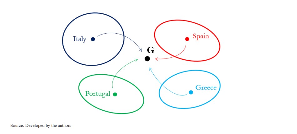 The 17 variables used were divided into four sub-clouds corresponding to each country. Each country may behave more or less differently from the others. Using this technique, the four sub-clouds were re-centred with respect to the overall centre of gravity (G) of the four countries as a whole (Figure 1), i.e., their barycentric coordinates were moved to the global origin. The overall inertia of the point cloud was decomposed, as well as the sum of the ‘intra’ inertia in each sub-cloud and the ‘inter’ inertia of each barycentre with respect to the global centre. The effect of re-centring involved eliminating the ‘inter’ dispersion and performing an ‘intra’ analysis only. The conditional MCA therefore involved a unified analysis of the different territories. The interest lies in a joint comparative study of Spain, Italy, Greece, and Portugal on a common basis1.